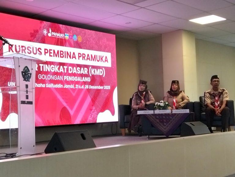 Jambi, 21 Desember 2025, Dr. Mardalina. S.Ag.,M.Ud, mewakili Ketua Gudep 02.581 – 02.582 UIN STS Jambi membuka acara Kursus Pembina Pramuka Mahir Tingkat Dasar (KMD) Pengalang , di Amphiteater lt.4.