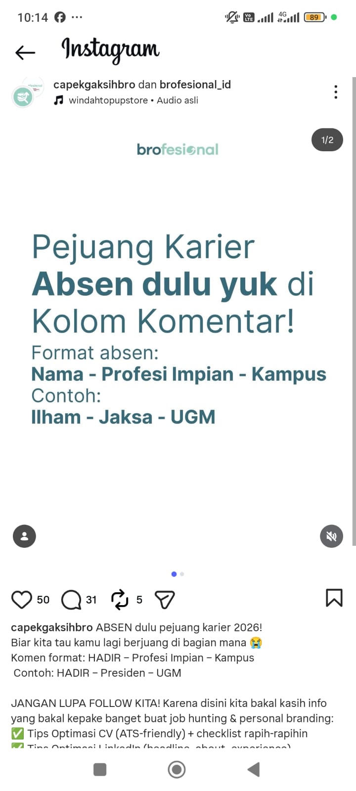 Biar info + materi nggak ketimbun di chat WA, kita sediain nih basecamp khusus buat kalian di Instagram: @capekgaksihbro πβ WAJIB FOLLOW ya karena di sana kita bakal kasih info yang bakal kepake banget buat job hunting & personal branding:β template CV (ATS-friendly) + checklist rapih-rapihinβ template LinkedIn (headline, about,