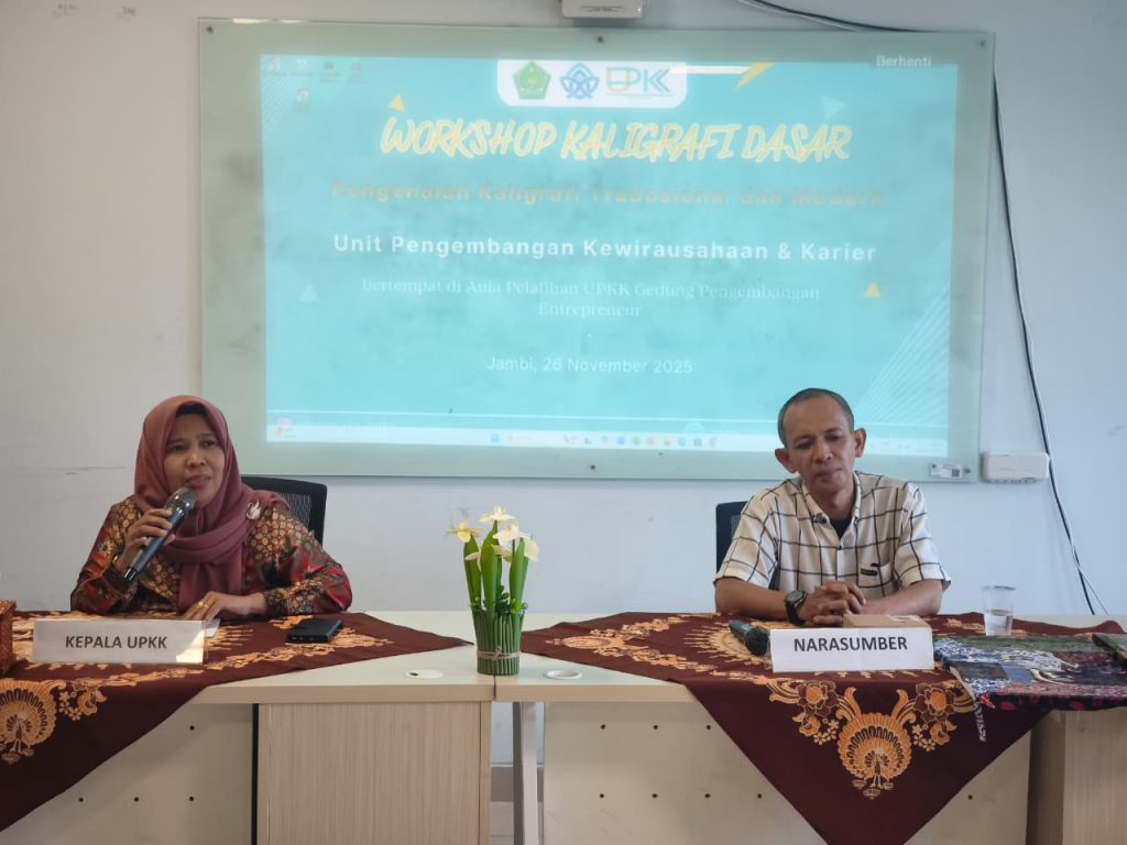 26 November 2025 – UPT Pengembangan Kewirausahaan dan Karier melaksanakan kegiatan workshop Kaligrafi Dasar dengan Tema “Pengenalan Kaligrafi Tradisional dan Modern”. Kegiatan ini dilaksanakan di aula pelatihan UPKK lt 2 Gedung Pengembangan Entrepreneur UIN STS Jambi